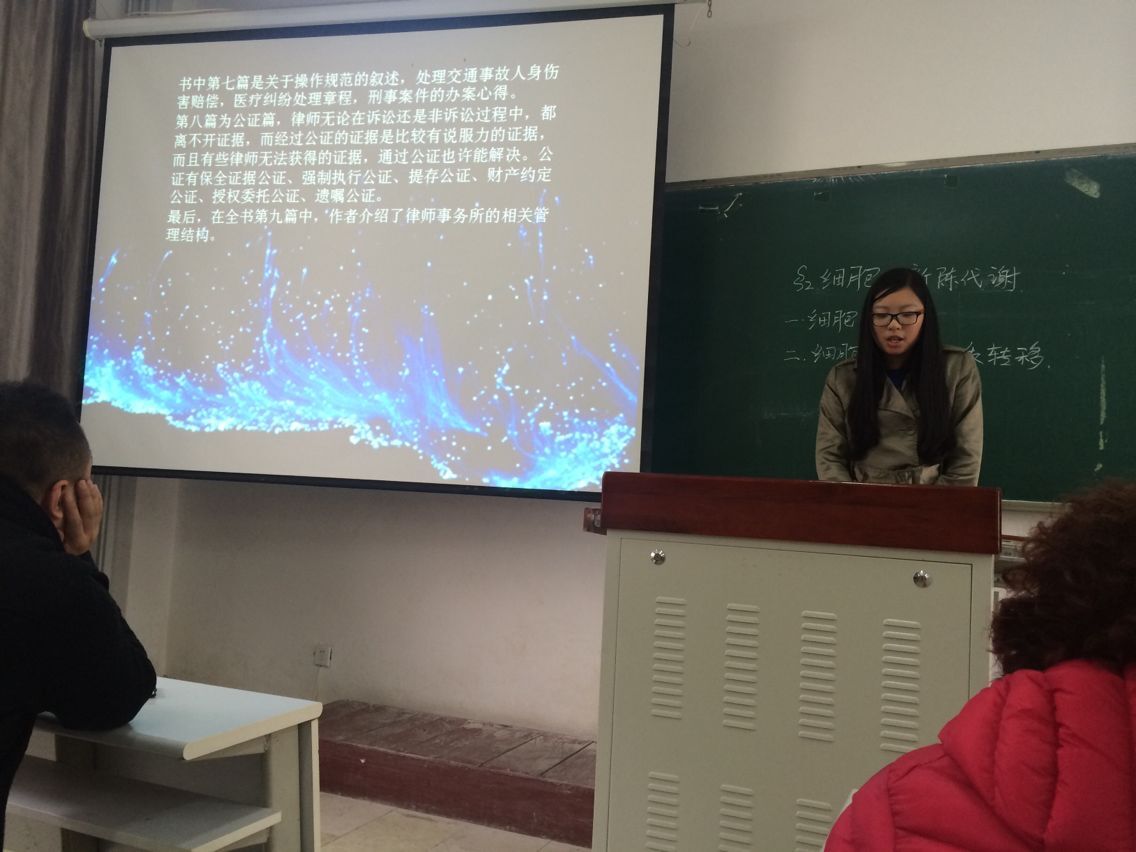 法学读书沙龙创办于2014年10月,沙龙本着“以文会友,共同耕耘一片法律文化的绿洲”为宗旨,以追求法律真知为目的,为2014级法学新生提供一个展示自己、发现自己、超越自己的文化平台。法学读书沙龙包括两个板块:好书推荐和关注热点。在本期“好书推荐”板块中,有三位同学做了精彩的发言。他们充分利用多媒体等方式向大家推荐自己喜欢的法学名著、经典案例或法制节目,分享他们的心得体会。在“关注热点”板块中,九位同学围绕“从黄海波案看中国收容教育制度的合法性与合理性”这一话题展开了激烈的讨论。大家唇枪舌剑,气氛热烈,并带动了听众参与的热情。本次读书沙龙在一阵阵争论和掌声中圆满结束。