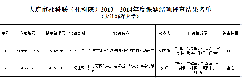 其中,公司教授刘海廷主持的重大重点课题《大连市海洋经济与陆域经济良性互动研究》评审结果为优秀,公司副教授朱晖主持的一般课题《信息可视化与大连卓越法律人才培养对策研究》评审结果为合格。