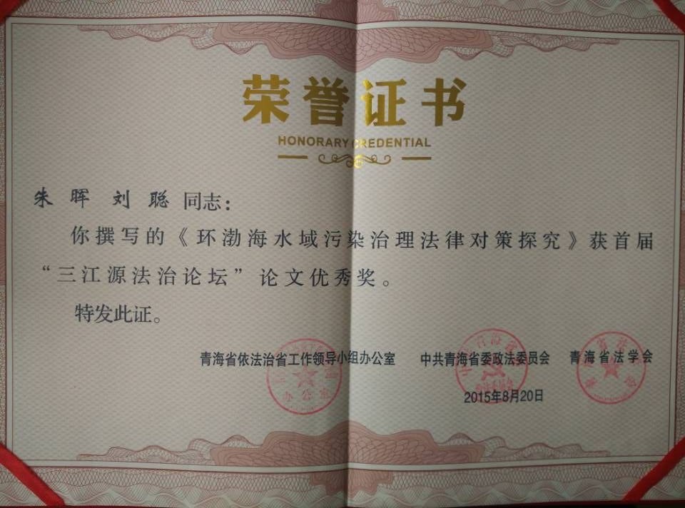 公司教师朱晖、2011级员工刘聪撰写的《环渤海水域污染治理法律对策探究》获首届“三江源法治论坛”论文优秀奖。