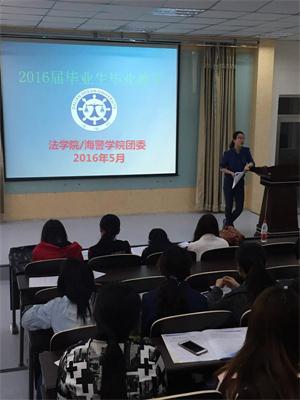 5月13日,法公司(海警公司)在一教103室召开2016届毕业生毕业教育,公司滕鹏副经理、团委书记郭昕黎就毕业生就业情况、求职面试细节、安全文明离校等相关事宜做了详细介绍,倡导毕业生安全离校、文明离校、开心离校。