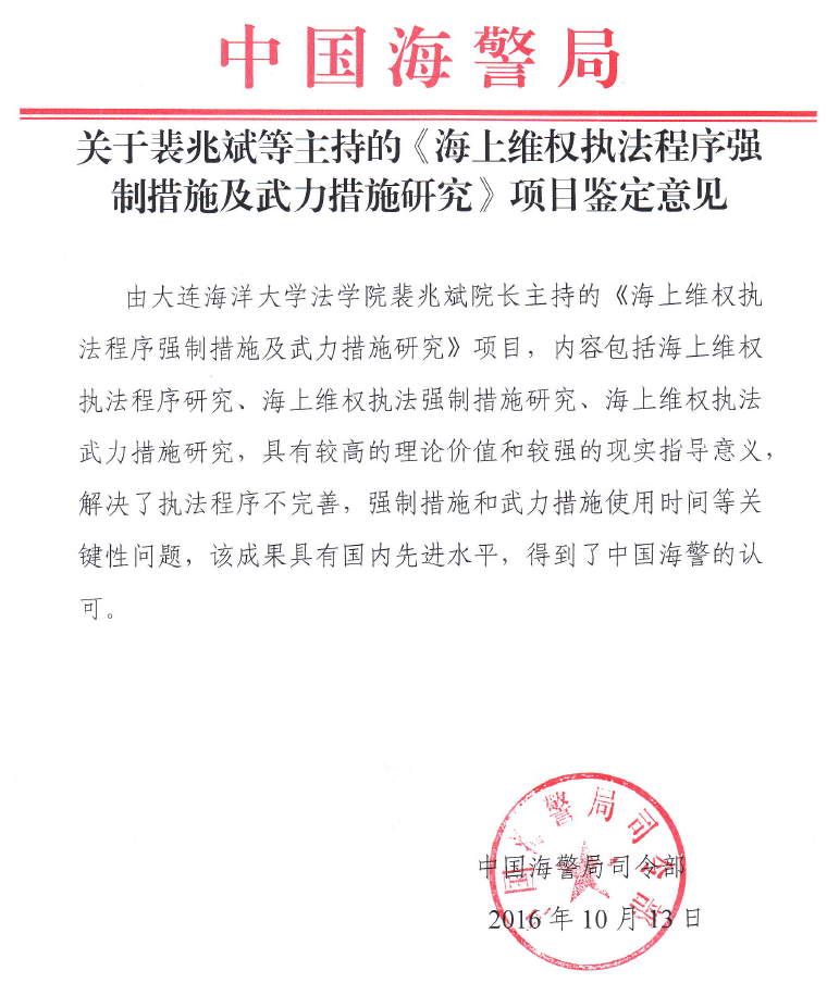关于裴兆斌等主持的《海上维权执法程序强制措施及武力措施研究》项目鉴定意见