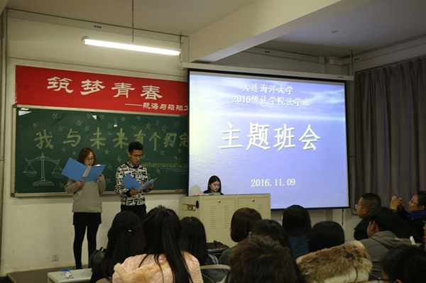 2016年11月8日晚,法公司、海警公司法学专业于渤海校区2-302举办了以“我与未来有个约定”的主题班会。参加本次班会的有班导师吕方园、辅导员王鹏艳、大二员工代表及2016级法学专业全体同学。此次班会旨在让同学们树立明确的目标与理想,珍惜当下,为未来而行。