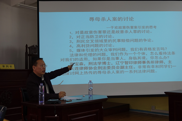 为了提高法学专业员工实务水平,增强员工对社会热点问题的关注度,法公司(海警公司)于4月11日在渤海校区一教427模拟法庭教室组织员工开展辱母杀人案的讨论活动。大会特别邀请了辽宁智印律师事务所主任、大连律师协会刑法委员会副主任,张宝森博士作为主讲人。
