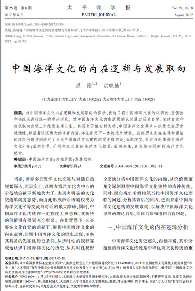法公司(海警公司)洪刚副教授以第一作者在《太平洋学报》第25卷第8期发表题为“中国海洋文化的内在逻辑与发展取向”的封面文章。文章对中国海洋文化内在逻辑和发展取向的探析,表达了将中国海洋文化的认识论、价值论和实践论进行统一的理论诉求。对中国海洋文化内在逻辑的认识通过历史自觉、主体自觉和价值取向自觉三个维度表现出来。其历史价值分析表明,中国海洋文化具有一以贯之的历史延续性,彰显着深沉博大的丰富内涵,洋溢着天下一体的无外精神。这些历史先在条件和面临的现实问题共同决定了当代中国海洋文化建构的发展取向是:面向现实,延续与时俱进的海洋文化生命;面向世界,开创包容互鉴的海洋文化格局;面向未来,肩负综合创新的海洋文化使命。