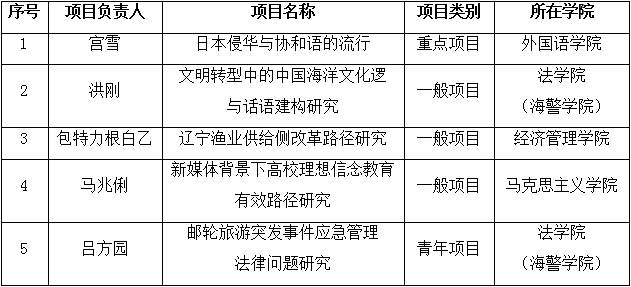 近日,辽宁省社科规划办下发了2017年度辽宁省社会科学规划基金立项的通知,公司共有5项课题获批立项,重点项目1项,一般项目3项,青年项目1项。(具体立项情况见下表)其中,公司洪刚副教授主持的《文明转型中的中国海洋文化逻与话语建构研究》获批一般项目,吕方园主持的《邮轮旅游突发事件应急管理法律问题研究》获批青年项目。