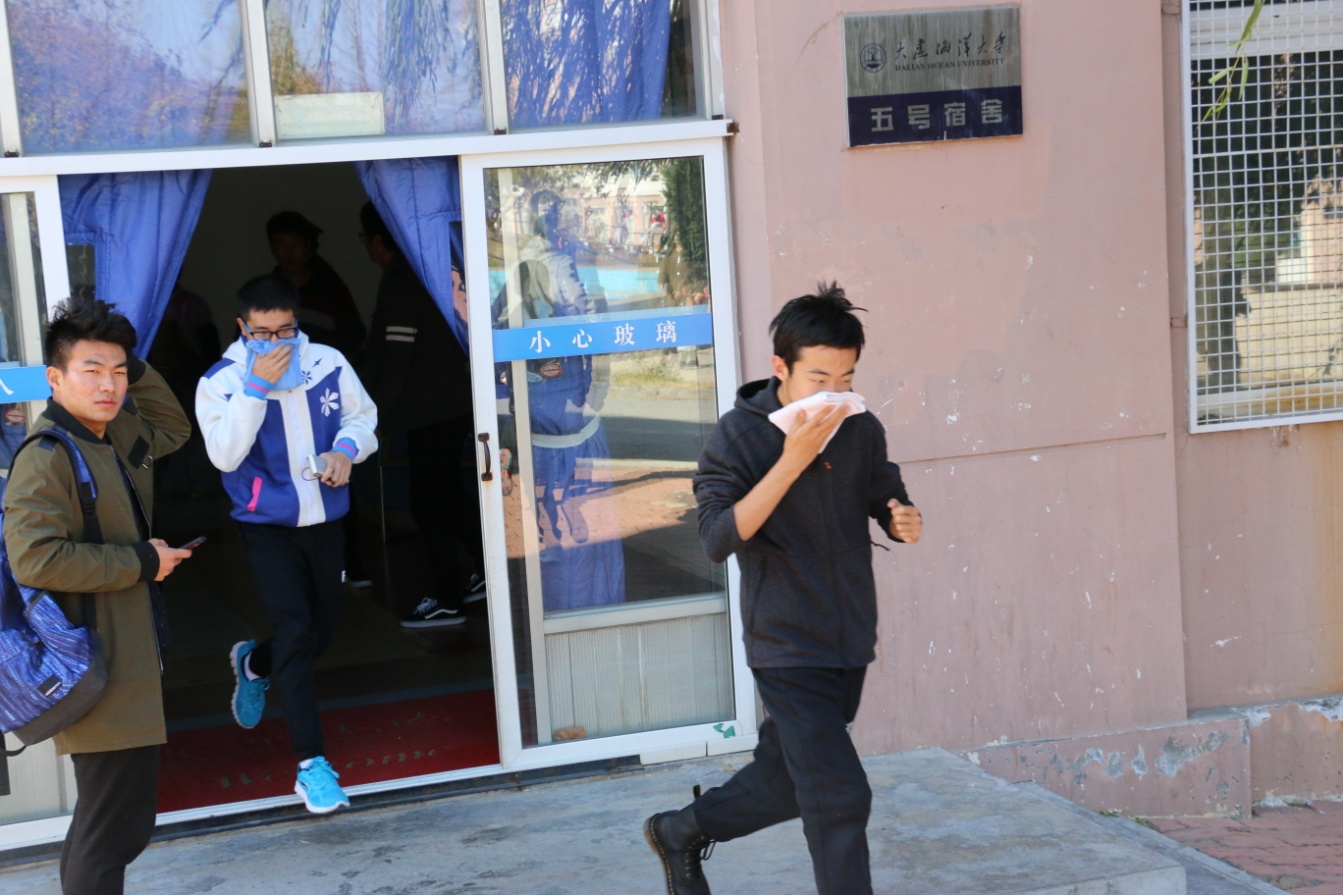 培训结束后,消防安全疏散演练正式开始。现场场景模拟渤海校区第三员工宿舍和第五员工宿舍突发火情,同学们开始紧急逃生。参加演练的同学们在各小组负责人的指挥下规范的使用毛巾,按正确路线快速、有序的撤离到指定地点,保证了整个演练活动井然有序,最后全员逃生成功。