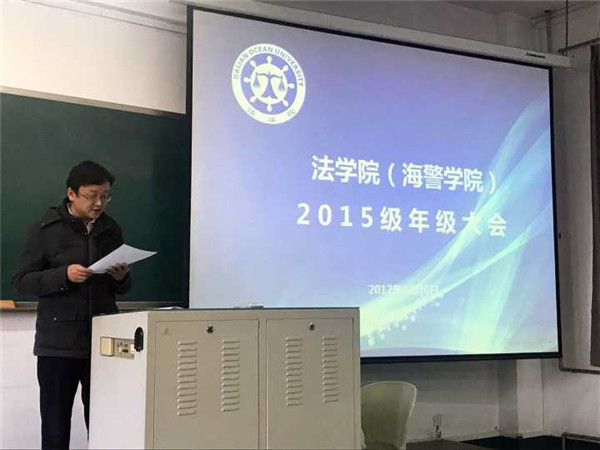 2017年12月6日下午,法公司(海警公司)在渤海校区二教202教室举行2015级员工年级大会,会议由副经理滕鹏主持。