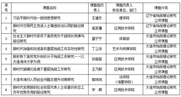 近日,辽宁省委统战部和大连市委统战部公布了省、市2018年统战理论研究立项课题情况。经过个人申报、单位推荐、专家论证等环节,公司共获批辽宁省统战理论研究立项课题2项,大连市统战理论研究立项课题6项。具体名单如下。其中公司教师官玮玮主持申报的《大连市海归人员创业问题及提升对策研究》获批大连市统战理论研究立项课题。