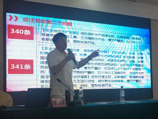 应山东省海洋与渔业监督监察总队邀请,公司法公司(海警公司)经理裴兆斌教授于8月21日到访山东威海。为山东省90余名渔业行政执法人员及海洋展馆负责人进行了主题为“水生野生动物保护法律责任解析”的讲座。裴兆斌经理首先对《野生动物保护法》的10种违法行为及相关犯罪行为的构成结合案例进行了详细讲解,包括野生动物保护实施条例、行刑衔接、2个涉海司法解释等。而后,裴兆斌教授又对水生野生动物保护涉嫌犯罪案件移送应注意的问题进行了讲解,包括移送程序、条件及不依法移送的法律责任等。