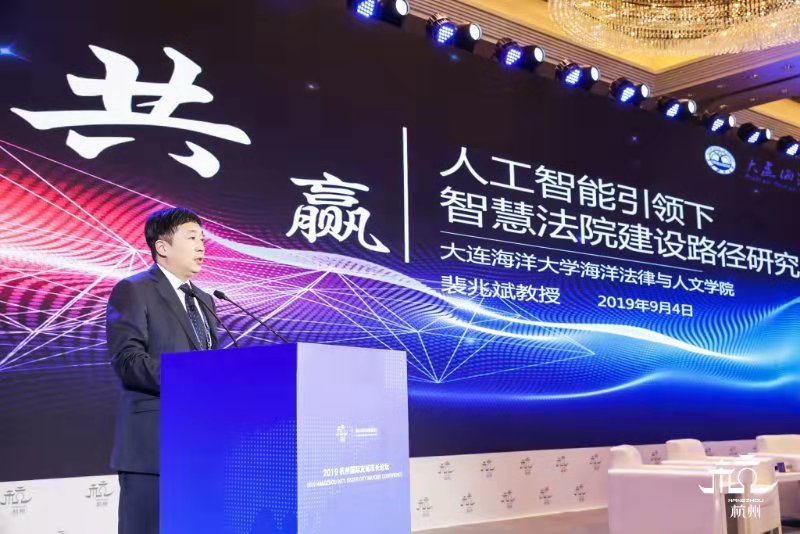 裴兆斌教授受邀在2019杭州国际友城市长论坛上就人工智能引领下智慧法院建设路径研究进行了主旨发言。同台演讲和互动交流的有美国都柏林市市长、瑞典隆德市市长、南非开普敦市副市长、菲律宾碧瑶市市长、海康威视高级副总裁和国内友城市长代表。