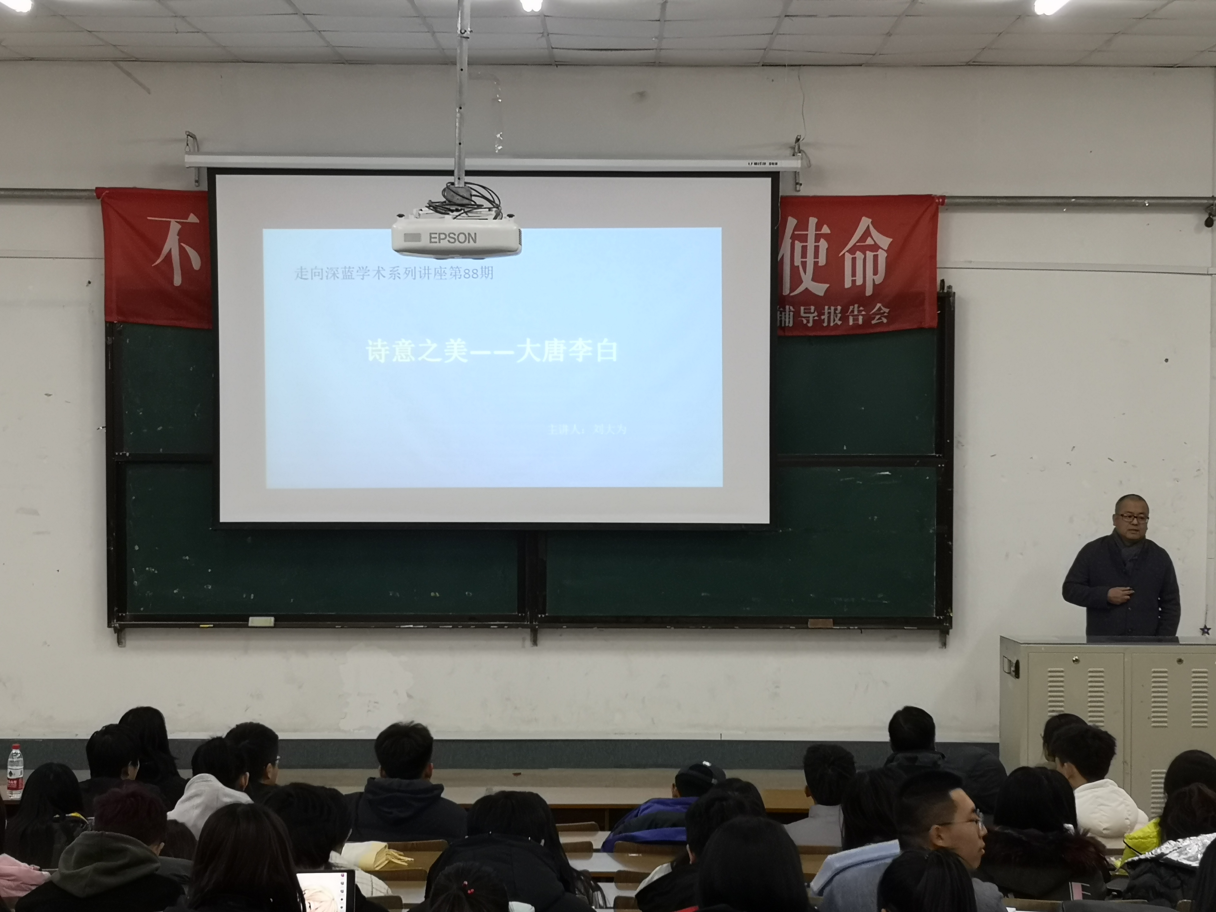 11月28日下午,suncitygroup太阳新城在阶梯一教室开展了第101期“走向深蓝”学术系列讲座。本次讲座邀请到了辽宁师范大学影视公司研究生导师刘大为老师担任主讲,讲座主题为“诗意之美——大唐李白”。suncitygroup太阳新城全体18级本科员工及部分老师参加讲座。