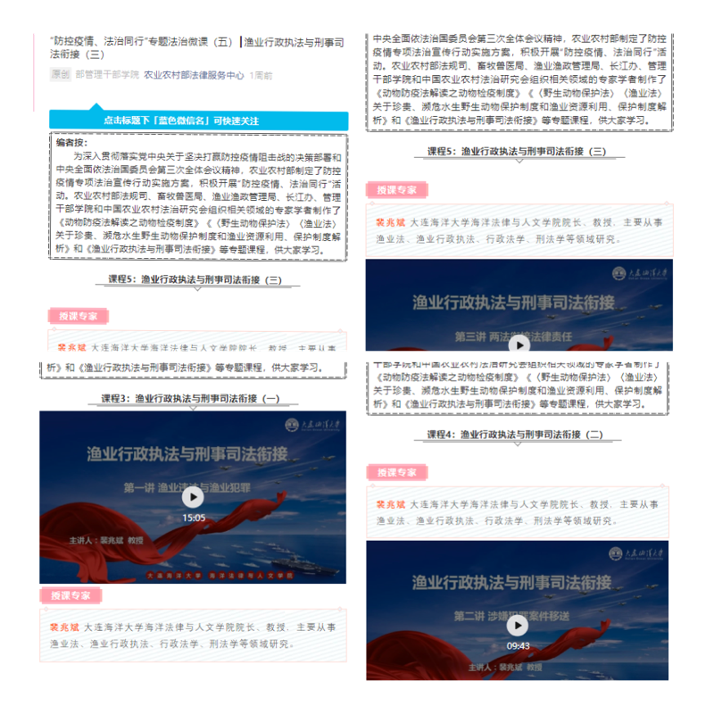 共计五讲,裴兆斌教授主讲三讲,分别就渔业违法与渔业犯罪、涉嫌渔业犯罪案件移送、两法衔接法律责任进行了讲解。