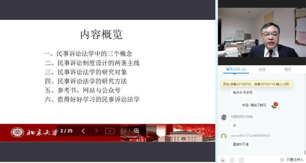 为了丰富法学专业同学的专业知识,推进线上学习和交流。公司充分利用在家网上学习的时间开展了法学名师大讲堂。2020年4月24日19:00-20:00,“云端”名师大讲堂第七讲开播。法学教研室会同法硕中心组织法学专业本科生和法律硕士研究生在线收看了中国大学MOOC开放的学术讲座 “三言两语话民诉:民诉法学学习入门纲要”,由北京大学法公司教授潘剑锋主讲。