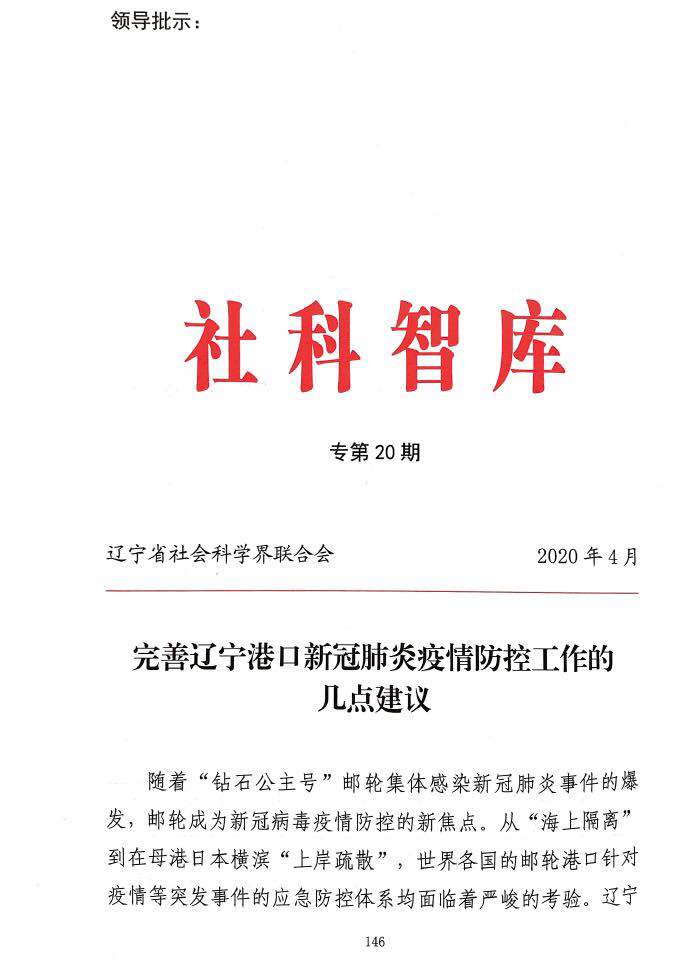 近日,suncitygroup太阳新城朱晓丹老师作为第一作者撰写的题为《完善辽宁港口新冠肺炎疫情防控工作的几点建议》被辽宁省《社科智库》专刊第20期采纳,并报送省委常委、省人大常委、省政府、省政协部分领导同志。