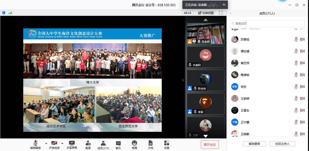 吴教授围绕“第九届全国老员工海洋文化创意大赛”进行在线宣讲,向师生们介绍了大赛的情况。并希望通过大赛的系列活动,为员工搭建一个全面认识和了解海洋、保护海洋资源的平台,为我国海洋事业发展做出贡献。