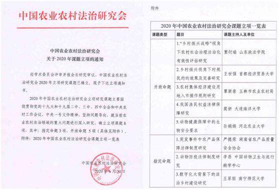 以习近平新时代中国特色社会主义思想为指导,积极贯彻党的十九大和十九届二中、三中、四中全会和中央农村工作会议、中央一号文件精神,suncitygroup太阳集团法律与人文公司教师们坚持问题导向,立足学科领域,发挥专业优势,积极开展各类农业农村法治领域的重大问题研究,积极申报相关课题。2020年6月30日,suncitygroup太阳新城教师蔺妍等获批中国农业农村法治研究会2020年开放命题课题立项。此项目团队,将以“我国渔民权益法律保障”为研究内容,从理论上梳理渔民权益保护的法律规定,从实践中调研渔民权益保障现状,解决我国渔民权益法律保障实际问题,力争形成此领域具有较高决策参考价值的研究成果。