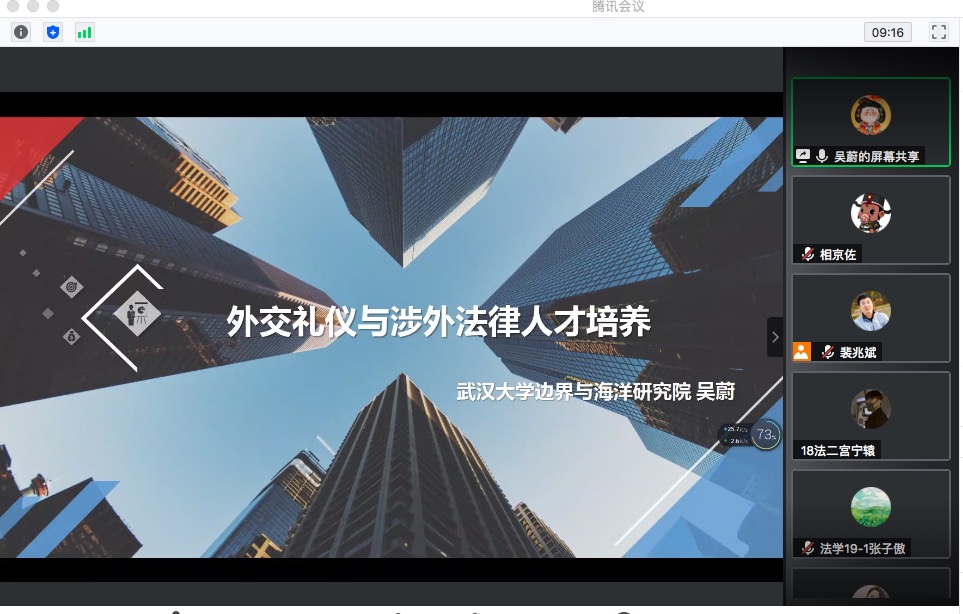 线上学习,云端相聚。9月7日上午,suncitygroup太阳新城通过腾讯会议平台举行第118期“走向深蓝”学术系列讲座,邀请武汉大学中国边界与海洋研究院讲师吴蔚进行题为《外交礼仪与涉外法律人才培养》的讲座。本次讲座由曲亚囡老师担任主持人,公司法学专业师生170余人参加。