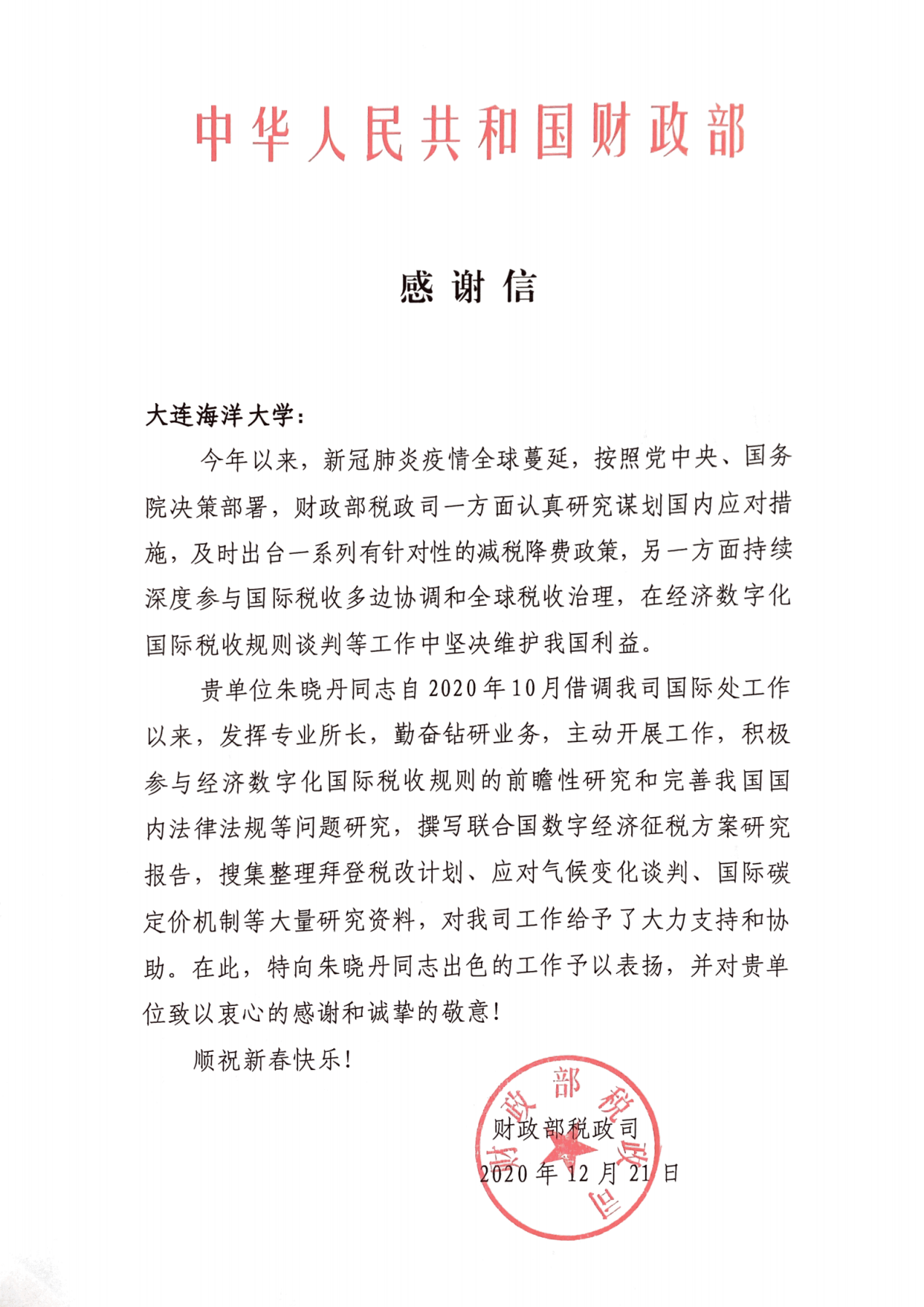 近日,财政部税政司向公司发来感谢信,对公司suncitygroup太阳新城教师朱晓丹在借调税政司国际处以来的工作表示感谢。感谢信指出,朱晓丹同志自2020年10月借调财税司工作以来,发挥专业所长,勤奋钻研业务,主动开展工作,积极参与经济数字化国际税收规则的前瞻性研究和完善我国国内法律法规等问题研究,撰写联合国数字经济征税方案研究报告,搜集整理拜登税改计划、应对气候变化谈判、国际碳定价机制等大量研究资料,对税政司工作给予了大力支持和协助。财税司向朱晓丹同志出色的工作予以表扬,并对公司致以衷心的感谢和诚挚的谢意。