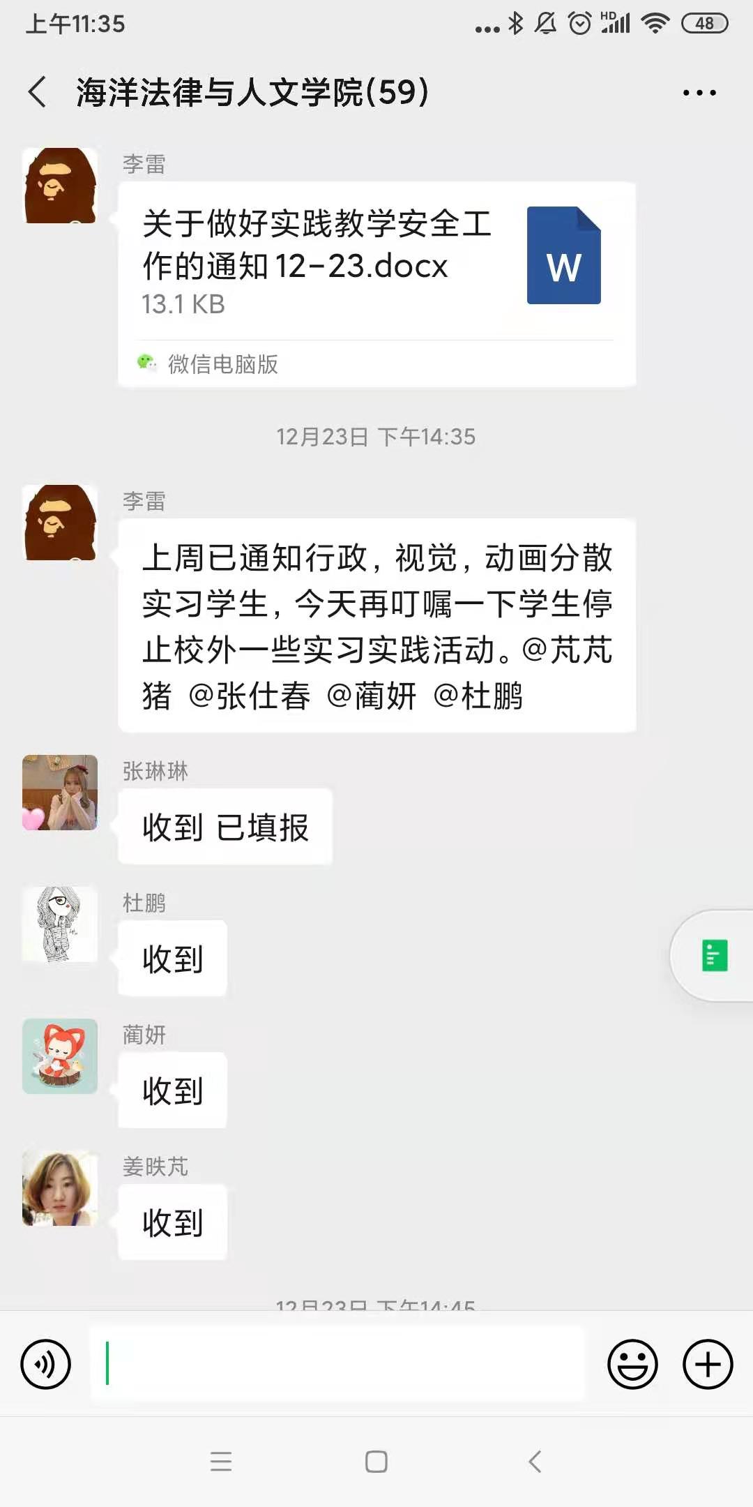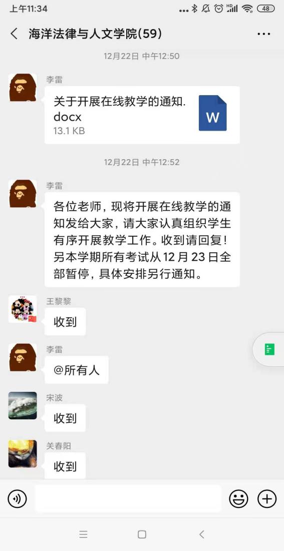 图 教学经理李雷在公司教师群中发布线上教学相关通知