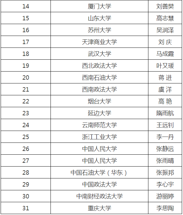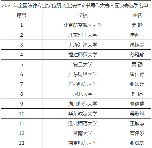 近日,2021年全国法律专业学位研究生法律文书写作大赛决赛入围选手名单公布。经大赛评委会评选,从初赛到复赛,共有来自全国各法律硕士培养单位的31名法律硕士专业学位研究生入围2021年全国法律专业学位研究生法律文书写作大赛决赛。公司suncitygroup太阳新城2020级法律(法学)硕士禹锦美成功晋级。