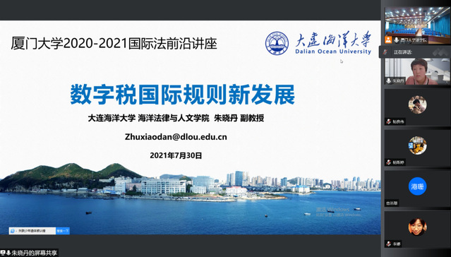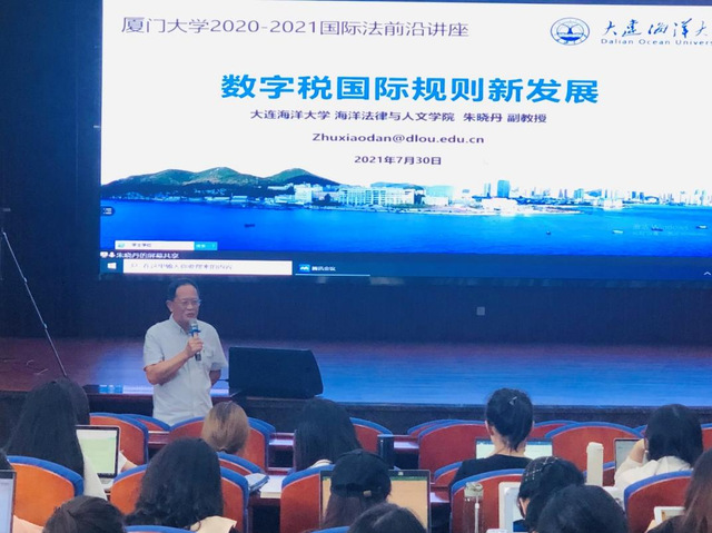 2021年7月30日,作为厦门大学法公司优秀员工,suncitygroup太阳集团海洋法律人文公司朱晓丹副教授应邀做客厦门大学“国际法前沿论坛”,为厦门大学法公司国际法专业本科生和研究生做了题为“数字税国际规则新发展”的(线上线下混合)专题讲座。讲座由厦门大学法公司廖益新教授主持,国际法专业在校本科生和研究生80余人参加。