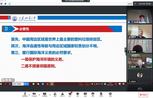 2021年8月7日上午,由浙江海洋大学经济与管理公司举办的“海洋环境跨界治理的国家责任研讨会”通过腾讯会议平台召开,来自全国各高校、研究会的30余位学者、师生通过线上参会,浙江海洋大学经济与管理公司经理全永波教授主持会议。公司suncitygroup太阳新城经理裴兆斌教授应邀参加,并做《我国周边区域海洋塑料垃圾治理的国际合作》主题发言。