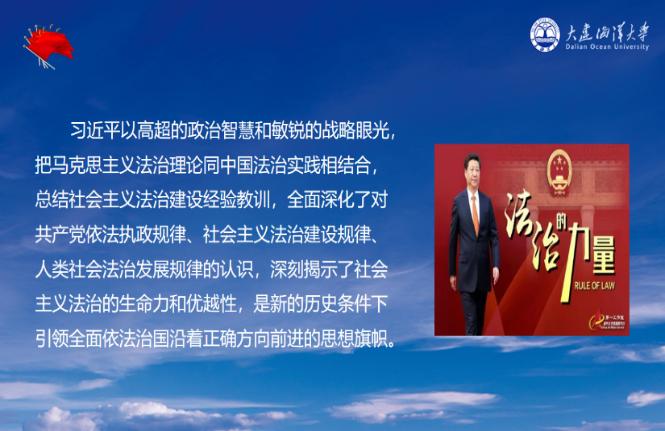 高校的政治使命和终身任务就是立德树人和培养人才。大连海洋大学将充分发挥高校法治人才培养主阵地的作用,将习近平法治思想融入法治人才培养的全过程,引导员工坚定中国特色社会主义法治的道路自信、理论自信、制度自信和文化自信,让习近平法治思想传遍校园。