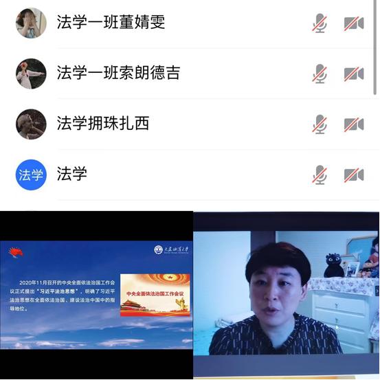 《习近平法治思想概论》课程温情开讲。本门课程于11月13日正式开课。受疫情影响,老师们利用已经搭建的课程平台,通过腾讯会议直播的方式,在“无情的疫情中”温情开讲。
