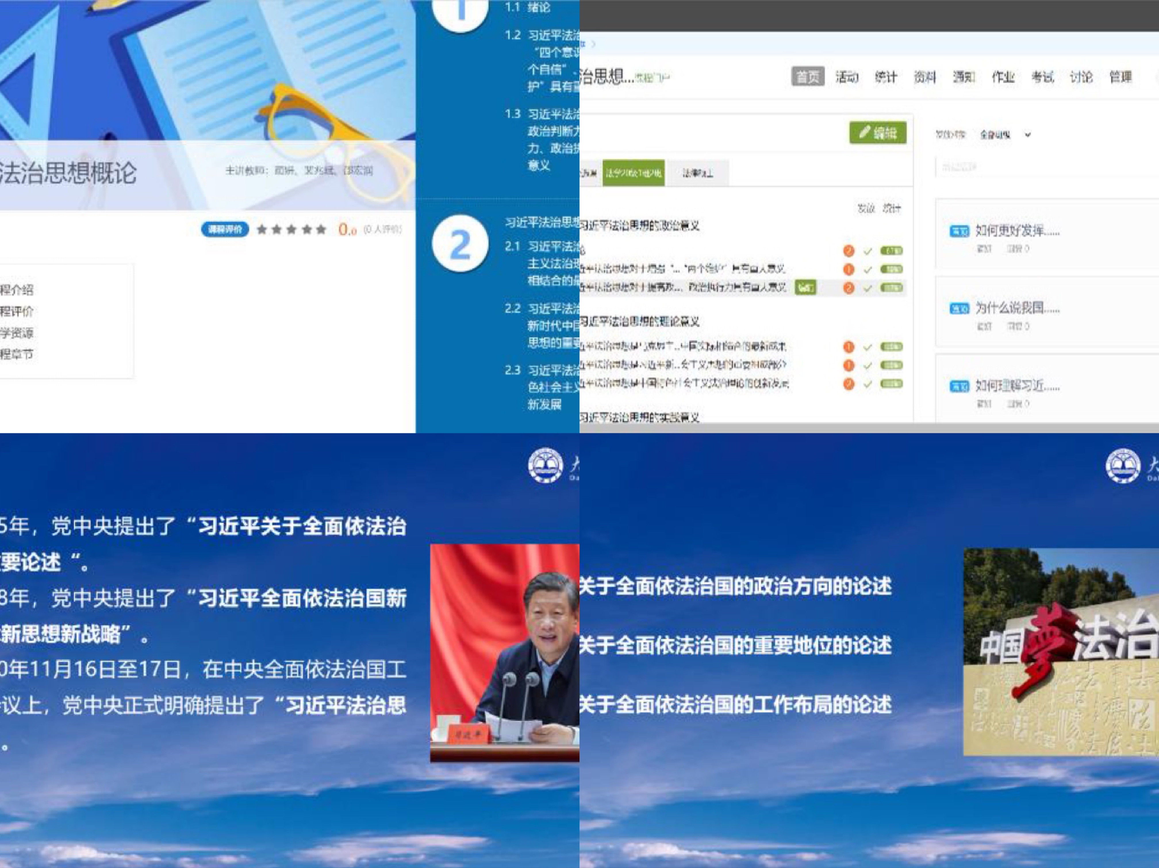 课程教学平台已经搭建。集团高度重视习近平法治思想的贯彻学习,在马工程教材出版后,团队教师进行集中研讨,分工备课,已经形成课程资料,并在超星学习通平台上搭建本门课程的网络教学资源。包含课程内容、班级建设、每章练习题及讨论题等。