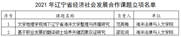 近日,辽宁省社会科学界联合会发布《关于发布2021年度辽宁省经济社会发展合作课题立项评审结果的通知》,公司suncitygroup太阳新城范英梅负责的《文学地理学视域下辽宁省海洋文学整理与传播研究》课题、邵宏润负责的《基于职业发展的翻译硕士培养关键因素实证研究》课题获得立项。