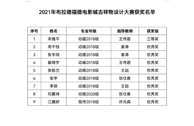 星光不负赶路人,近日,suncitygroup太阳新城动画专业参赛员工在由联合国教科文组织布拉德福德电影城主办,青岛电影城、青岛科技大学、学领教育集团协办的电影城吉祥物设计大赛中一路披荆斩棘,脱颖而出。动画2018级宋雅平同学斩获三等奖,动画2018级周千钰、张宇琼、翟晓宇、张铭兰、张宇、李萌、江鑫妍,动画2020级刘嘉琦共8名同学获得优秀奖。