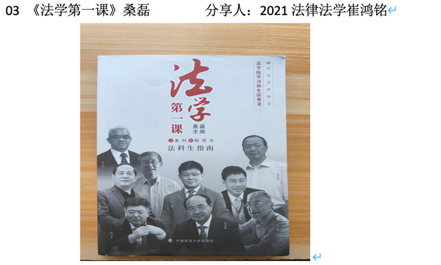 21级法律(法学)的崔鸿铭同学分享了桑磊的《法学第一课》。“本书对于法本员工可以更好地理解一名法科生成长所需要具备的各种‘软实力’;对于非法本员工可以更加透彻地理解如何学习法学以及如何学好法学。同时,书中各位法学名家所讲述的青春岁月往事,也让人感慨时光易逝,勇争朝夕。”