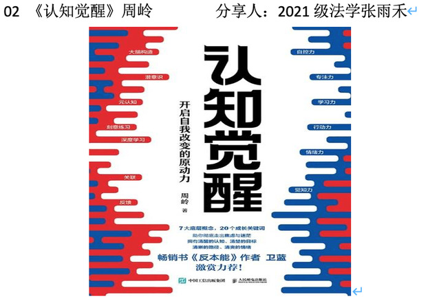 21级法学的张雨禾同学分享了周岭的《认知觉醒》。“这本书帮助我们开启自己身体本能的力量,打开认识自我的世界,特别是夜晚安静的时候,强烈推荐大家听这本书的朗读版。”