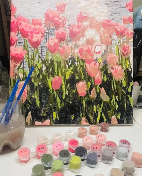 20级法律硕士潘昆池同学分享道:“封校期间是每天循环式的平淡重复。公寓管理区面积有限,每天在寝室里有时觉得很无聊,有时觉得很烦躁。在某个难以入睡的深夜,突然觉得应该做点什么让自己静下来,偶然想起之前画过的数字油画,便立马下单了一眼看中的郁金香,给平淡的生活添点颜色。颜料比较方便,画起来也比较容易上手,是一个强迫自己静下来的好选择。生活无聊,但要努力在浮躁中坐下来寻求平静,在这个过程中专注力得到了提升,也是一个自我治愈的过程。”