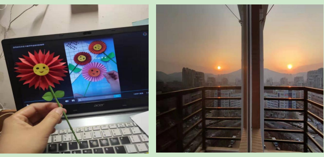 “与其每日在哀叹彷徨中度过,不如抓紧今日手中的惊喜。”21级法律硕士焦梦鸽说,“在疫情封闭期间,我的心情发生很大的变化。从盼望疫情早日结束的期待,再到逐渐适应现在的生活状态,经历几次不小的情绪波动。慢慢地,我学会了然应对当前的状况,在细小的生活琐事中,去发现治愈心灵的美好事物。读书之余,进行手工制作让我焦虑不安的情绪得以释放,瓣瓣的纸花在我的指尖绽放,仿若春风拂面。每天在同一地点拍摄同一轮落日,为枯燥的生活平添一份诗意。盼望着,疫情解封的那天,去更广阔的天地,拍摄更美的风景。”