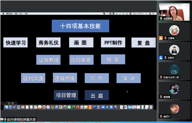 徐律师首先从律师应具备的十四项基本技能谈起,继而带领同学们探究了合同审查前、审查中、审查后的实务要点,深入浅出地讲授了合同审查过程中涉及的专业知识和注意事项,具体就合同审查的准备工作、审查逻辑、条款审查等内容进行了详细的讲解。同时,通过生动的现实案例和丰富的实务经验,将理论与实践相结合,与同学们分享了合同审查领域中经常遇到的法律问题和解决方案。