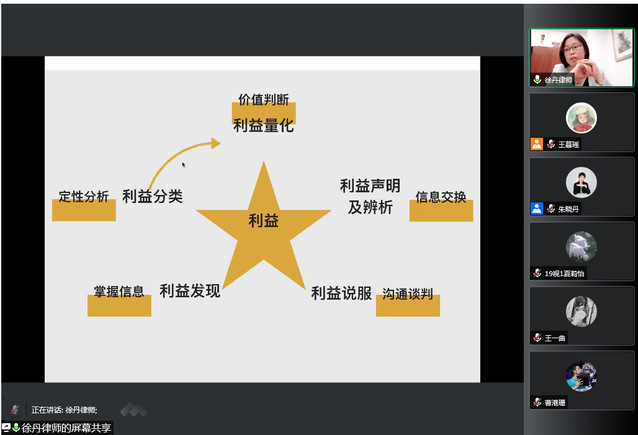 本次讲座,徐律师紧紧围绕法律谈判最为核心的要素——利益,从利益发现、利益分类、利益量化、利益声明及辨析、利益说服五大模块,分别具体介绍了谈判过程中如何更好地掌握信息、定性分析、价值判断、信息交换和沟通谈判。在此期间,徐律师以典型案件为例,层层递进,深入分析法律谈判的技术和策略,对法律谈判的技巧和谈判僵局的破解进行了详细的阐述,并积极引导同学们运用谈判风格测试进行自我谈判风格的定位和应对。最后,徐律师为同学答疑解惑,讲座在轻松愉快的氛围中结束。本次实务讲座作为法学专业实践教学周的内容深受员工欢迎,同学们纷纷表示收获良多,教学效果良好。