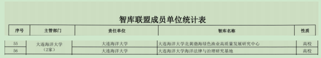 大连智库联盟由市委政研室、市人大常委会研究室、市政府研究室、市政协研究室、市发展改革研究中心牵头,吸纳国内知名智库参加。“海洋法律与治理研究基地”现为辽宁省区域经济发展研究重点基地,以我国海洋法律与政策作为主攻方向,以咨政服务为宗旨,以国家海洋战略为指引,以创新发展为驱动,以海洋学术研究为引领,以海洋人文交流为纽带,聚集各界力量,凝聚专家共识,建设服务于海洋事业和区域经济社会发展的高端智库。