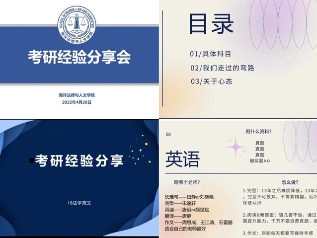 分享会上,范文、刘彤、贾琇婷、郭田蕾、杜慧澜、张雨琼六名同学依次发言,他们就英语、政治和专业课三个方面的学习方法做出了详细阐述,并分享了自己的考研时间安排、考研技巧、备考经验、择校经验,以及如何树立正确的考研心态。他们建议同学们不要盲目跟风和盲目比较,及时制定学习计划并复盘。考研是一场持久战,虽然过程辛苦,但是经过犹豫和胆怯后的坚定必将给同学们带来强大的力量!