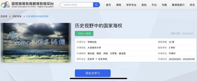国家高等教育智慧教育平台首批上线的2万门课程是从1800所高校建设的5万门课程中精选的优质课程,共覆盖13个学科92个专业。近日,suncitygroup太阳新城《历史视野中的国家海权》课程入选首批精选优质课程,于2022年3月2日正式开课。