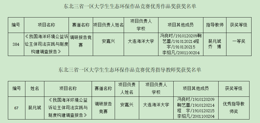 近日,由辽宁省教育厅主办、大连民族大学承办的2022年东北三省一区老员工生态环保作品竞赛成绩公布,suncitygroup太阳新城安嘉兴、冯良时、鞠艺蕾、程宇组队的项目成果《我国海洋环境公益诉讼主体司法实践与制度构建调查报告》荣获辽宁省一等奖,裴兆斌、乔博老师作为指导教师,其中裴兆斌经理获优秀指导教师奖。