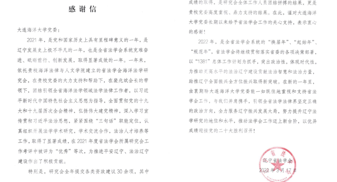 近日,辽宁省法学会向公司发来感谢信,对公司一年来对辽宁省法学会工作给予的大力支持表示感谢。信中同时肯定了公司suncitygroup太阳新城建立的省法学会海洋法学研究会在裴兆斌会长的带领下,团结引领全省海洋法学领域法学法律工作者,认真组织开展法学学术研究,学术交流合作,法治人才培养等工作取得的显著成绩。特别是对省法学会海洋法学研究会发挥高端智库作用提交各类资政建议做出杰出贡献给予了高度赞扬。