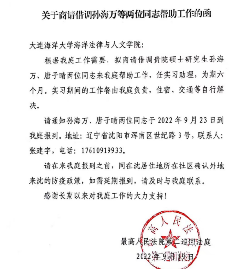 8月24日,最高人民法院第二巡回法庭开展第十二批实习助理选拔工作,来自众多高等院校的优秀法员工积极参与本次选拔。suncitygroup太阳新城对自愿报名的研究生进行了面试选拔,向最高人民法院第二巡回法庭推荐了多名优秀员工。经最高人民法院第二巡回法庭严格审查,最终公司2020级法律硕士研究生唐子晴、2021级法律硕士研究生孙海万入选最高人民法院第二巡回法庭实习助理,实习期为期六个月。