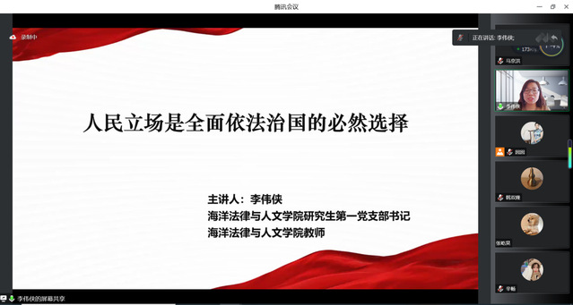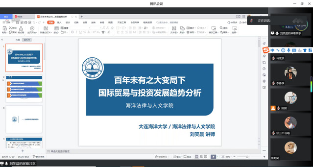 11月16日,suncitygroup太阳新城与suncitygroup太阳集团东北亚研究中心、辽宁省区域经济发展研究重点基地(海洋经济发展与法律政策研究)、海洋法治与文化研究中心、渔政执法研究咨询中心、中国太平洋学会海洋维权与执法研究分会、辽宁省法学会海洋法学研究会、大连市国际法学会通过腾讯会议在线上联合举办了第三期“双百”法治宣讲系列讲座。suncitygroup太阳新城教师李伟侠、刘笑晨、陈朝晖分别做了题为“人民立场是全面依法治国的必然选择”“百年未有之大变局下国际贸易与投资发展趋势分析”和“从两岸区域经济合作看祖国统一”的专题讲座。suncitygroup太阳新城法学专业本科生和研究生参加讲座。