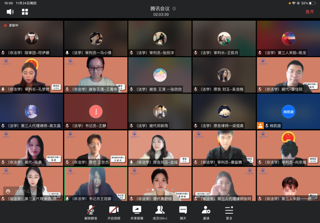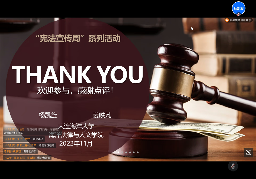 为认真学习党的二十大精神,深入贯彻习近平法治思想,推动员工学习宣传宪法,弘扬宪法精神,维护宪法权威。根据《辽宁省教育厅办公室关于开展2022年全省教育系统“宪法宣传周”系列活动的通知》的工作安排,结合suncitygroup太阳新城研究生工作实际情况,2022年11月24日,2022级法律硕士研究生线上开展模拟法庭演练活动。活动由法律硕士教育中心副主任杨凯旋和副主任姜昳芃主持,公司副经理王黎黎、曲亚囡、纪委书记蔺妍以及乔博副教授担任评委。