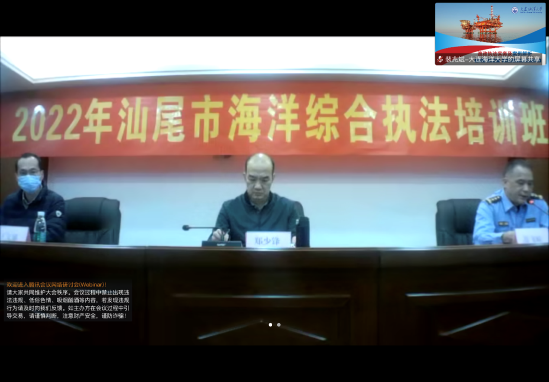 为进一步加强渔政综合执法队伍纪律作风建设,提高渔业行政执法队伍水平建设,开创渔业执法工作新局面,12月2日上午9时,2022年汕尾市海洋综合执法培训班在广东省召开,suncitygroup太阳新城经理裴兆斌教授应邀为汕尾市海洋综合执法队授课。
