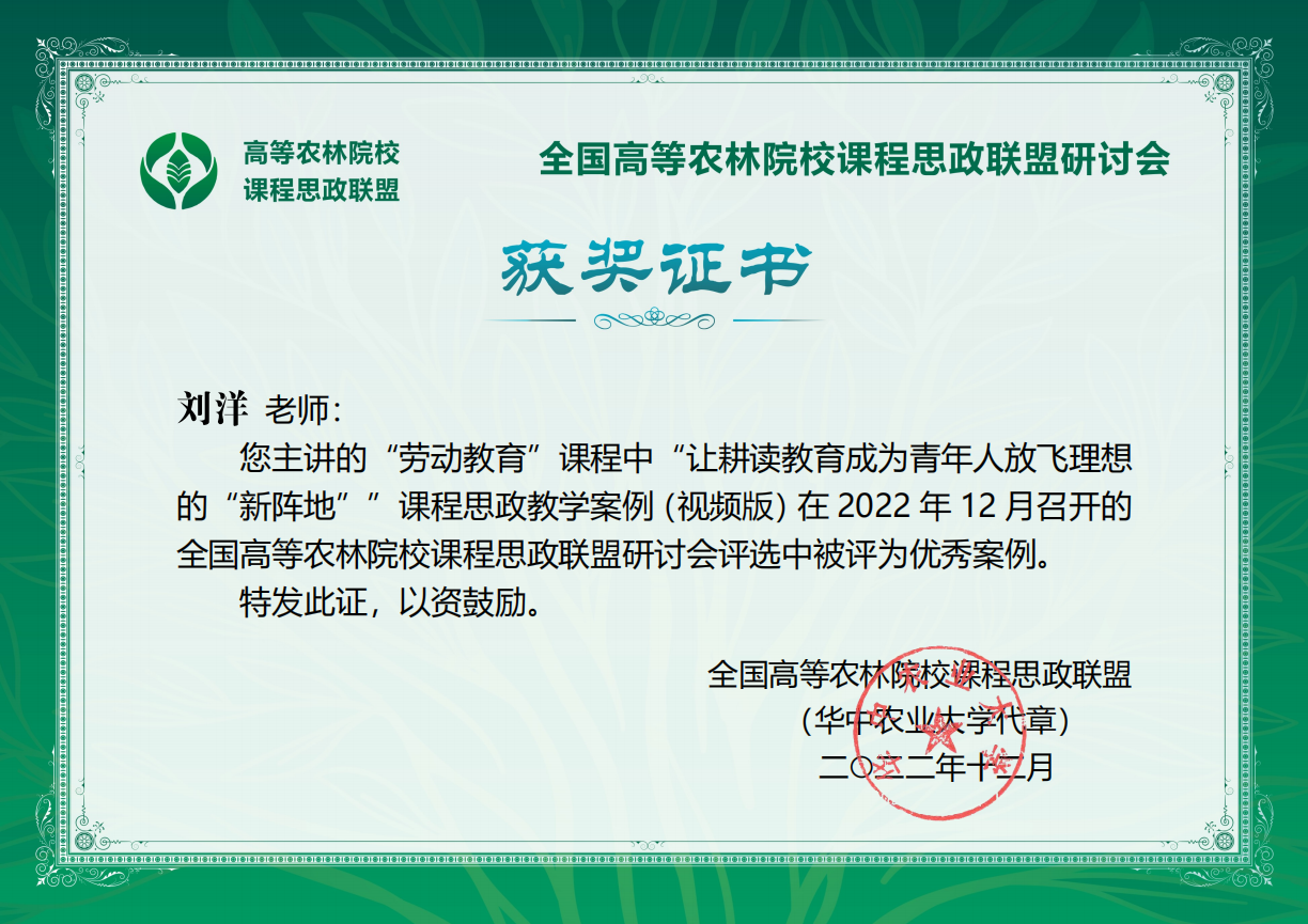 近日,由公司suncitygroup太阳新城社会政策教研室主任刘洋副教授主讲的《劳动教育》课程思政案例(视频版):“让耕读教育成为青年人放飞理想的‘新阵地’”,经评选推荐荣获全国高等农林院校课程思政联盟组织、华中农业大学承办的全国高等农林院校课程思政建设研讨会优秀案例。