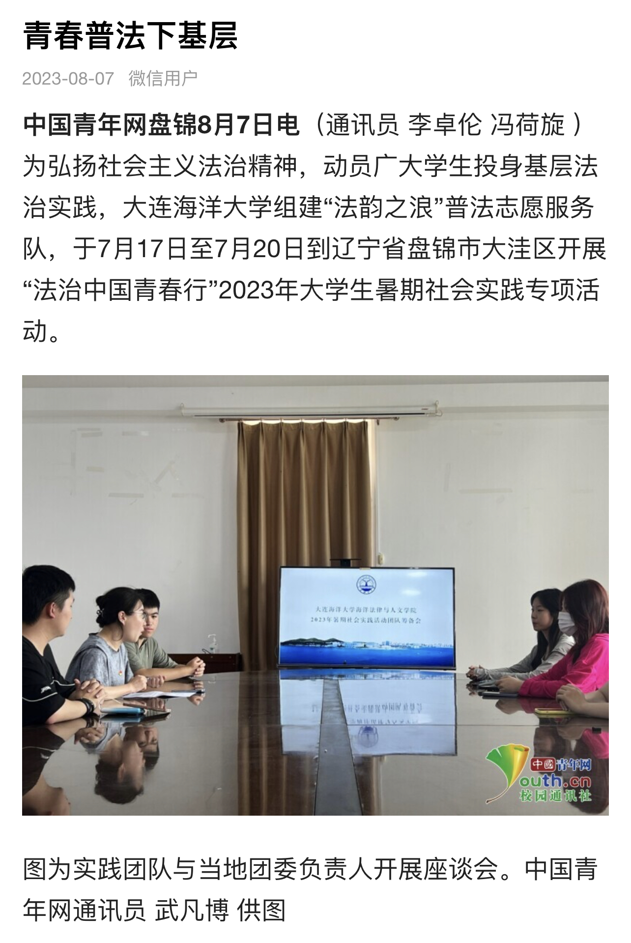 近日,中国青年网、《辽河晚报》以及共青团中央维护青少年权益部官方微信平台纷纷报道了公司suncitygroup太阳新城开展的2023年“法治中国青春行”全国老员工暑期社会实践专项活动。