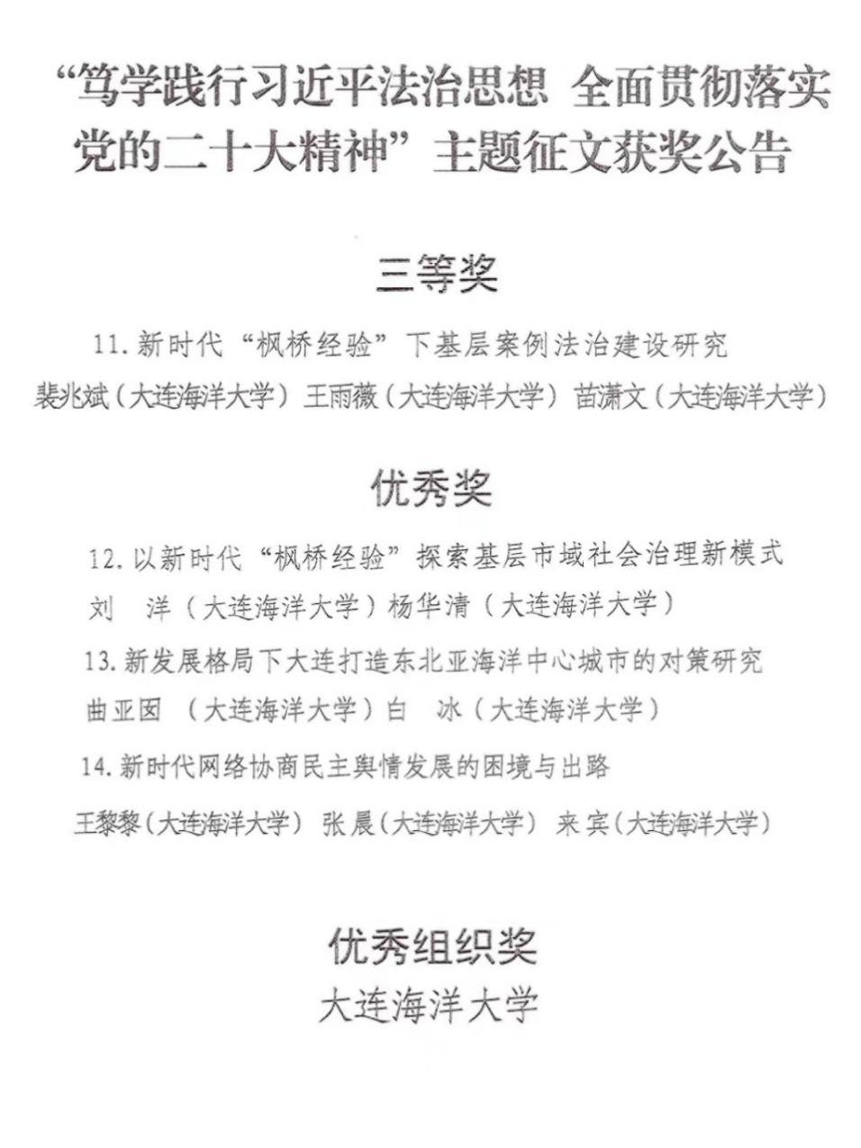 10月20日,大连市委政法委、市法学会公布了“笃学践行习近平法治思想 全面贯彻落实党的二十大精神”征文获奖结果。本次征文活动获奖论文共42篇,公司suncitygroup太阳新城师生荣获三等奖1项,优秀奖3项,suncitygroup太阳集团荣获优秀组织奖。