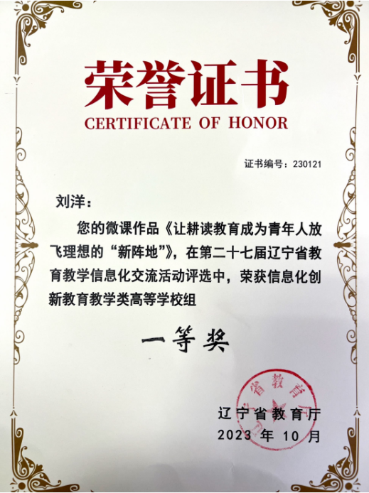 近日,辽宁省教育厅公布了“第二十七届辽宁省公司产品信息化交流活动”评选结果,suncitygroup太阳新城副教授刘洋的微课作品《让耕读教育成为青年人放飞理想的“新阵地”》荣获信息化创新公司产品类高等公司组一等奖。